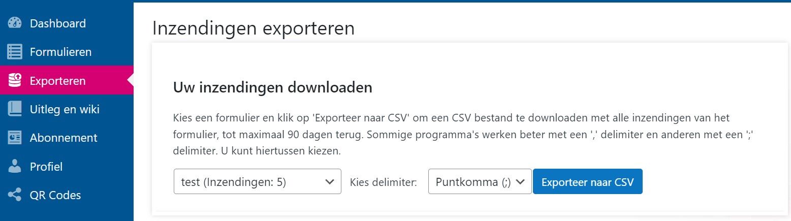 Hier kunt u per formulier uw inzendingen exporteren naar een .csv bestand om te bewaren of elders te importeren.