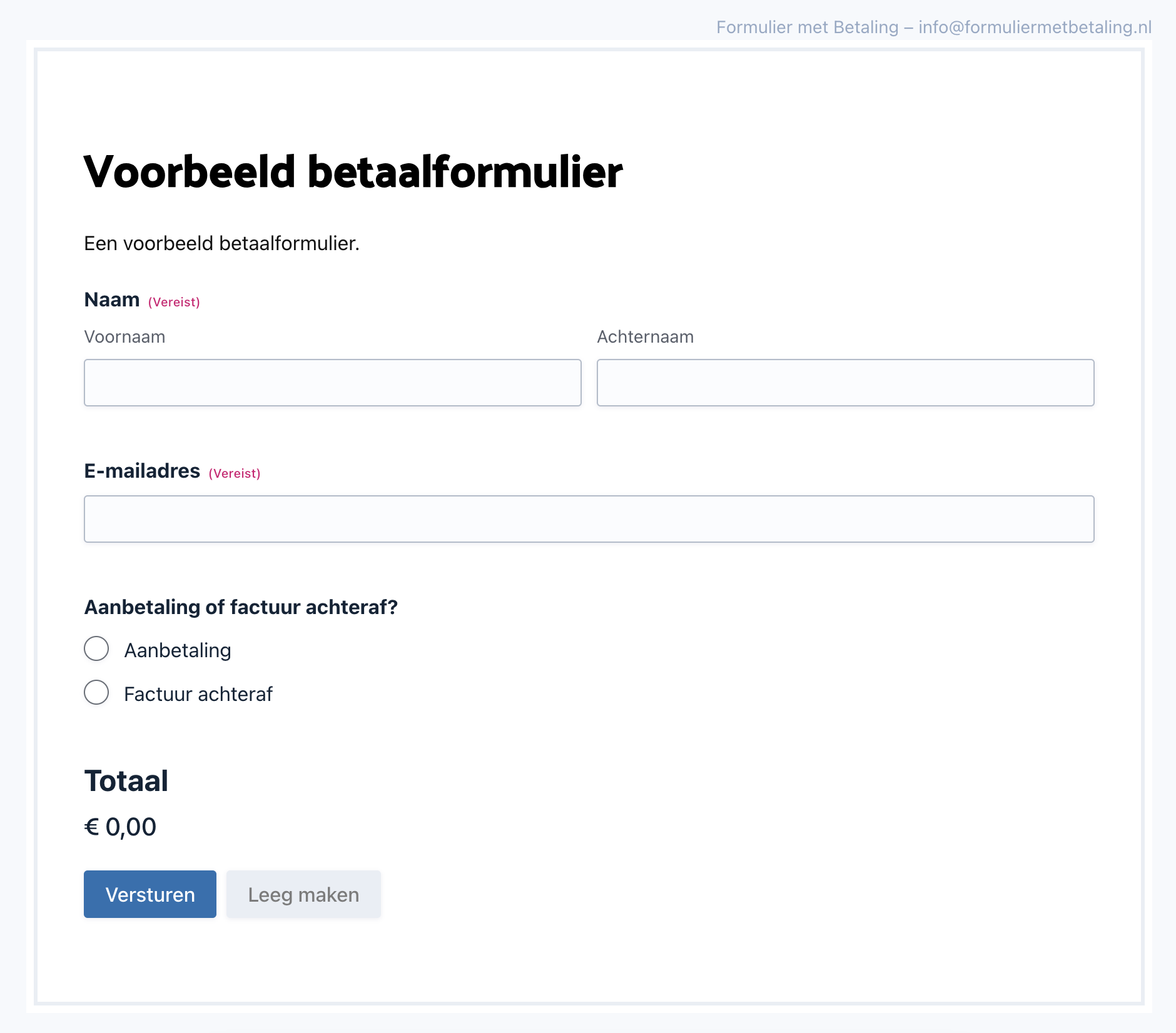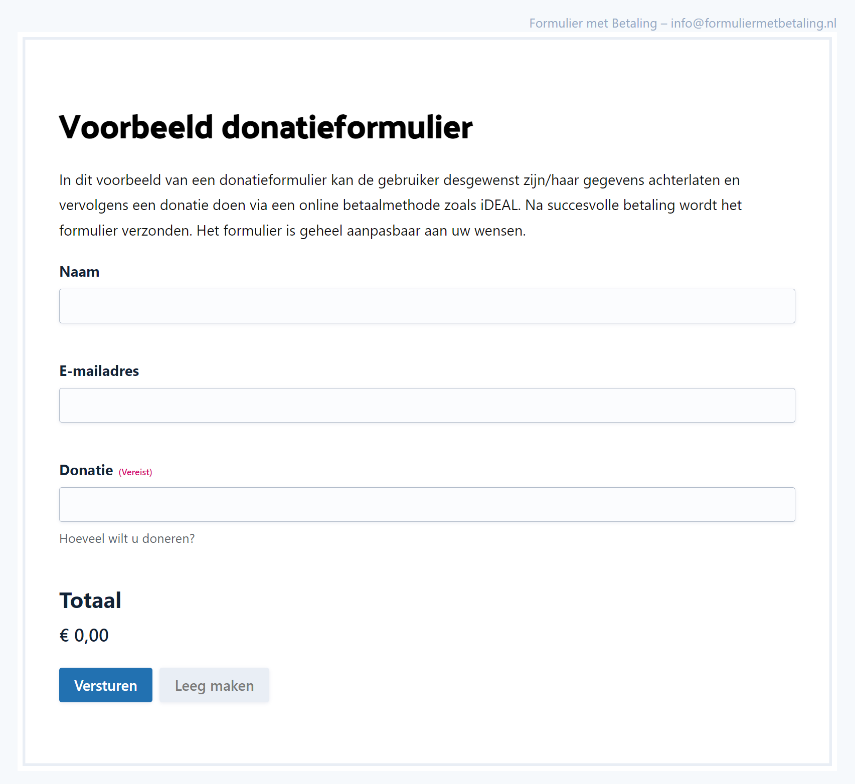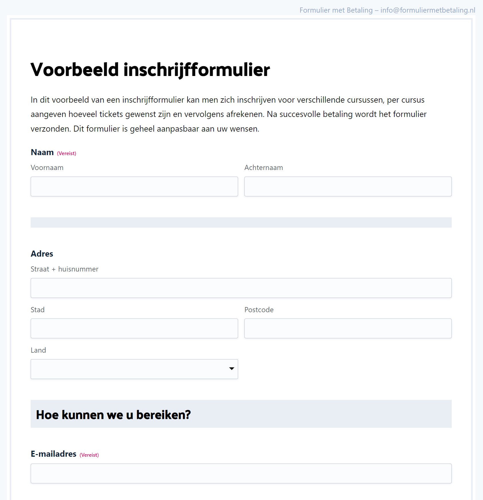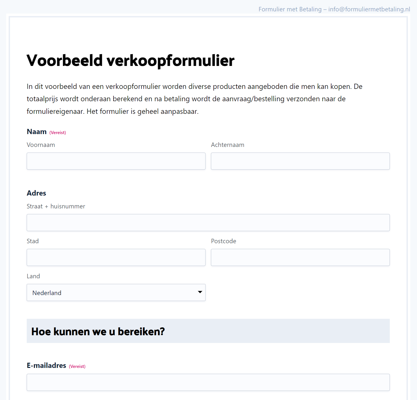 Op formuliermetbetaling.nl kunt u zelf formulieren bouwen voor inschrijvingen, het verkopen van producten, om informatie te vergaren, om donaties te ontvangen, etc.